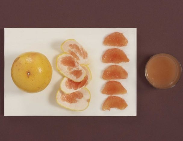 FacilePeler à vif les pamplemousses puis prélever 36 segments les plus beaux. Sur les parties restantes en extraire et filtrer le jus.