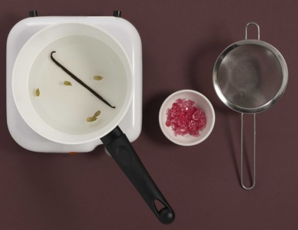 Porter a frémissement l’eau avec la vanille et la cardamome écrasée. Ajouter et fondre les bonbons de coquelicot concasses. Laisser maturer en casserole filmée durant 30 mn. Filtrer