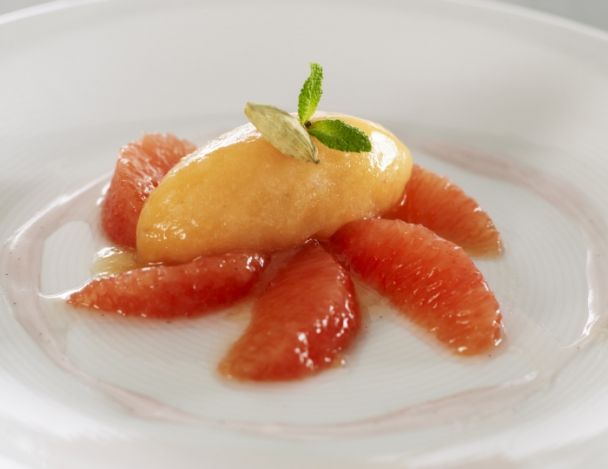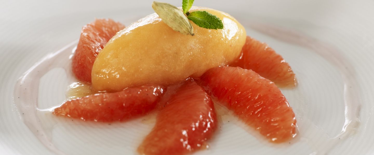 Disposer 6 segments de pamplemousse en rosace sur des assiettes creuses bien froides. Napper de l’infusion de cardamome/coquelicot. Déposer une belle quenelle de sorbet pamplemousse au centre.