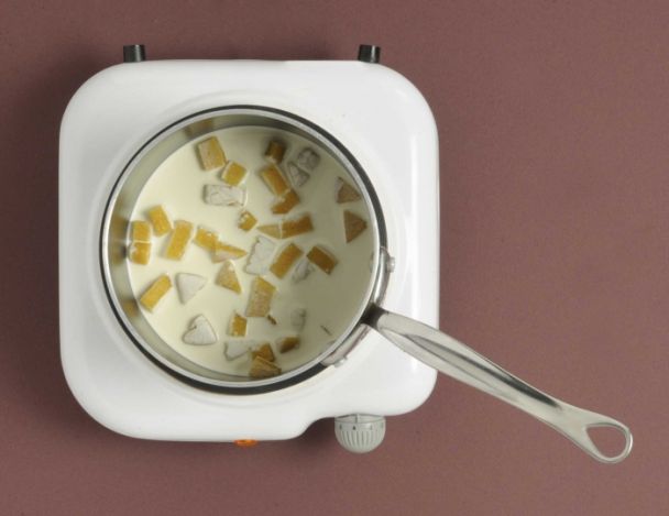 Couper les calissons en morceaux et les faire fondre dans une casserole avec la crème fleurette. Donner un bouillon.