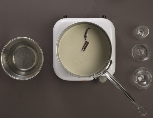 FacileTremper la gélatine dans un bol d'eau froide pour qu'elle se réhydrate. Porter la crème et le lait d'amande à ébullition avec le sucre, la demi-gousse de vanille fendue en deux et grattée et le bâton de cannelle. Ajouter la gélatine égouttée dans le lait et la crème chauds.