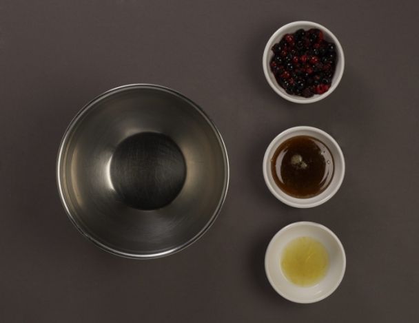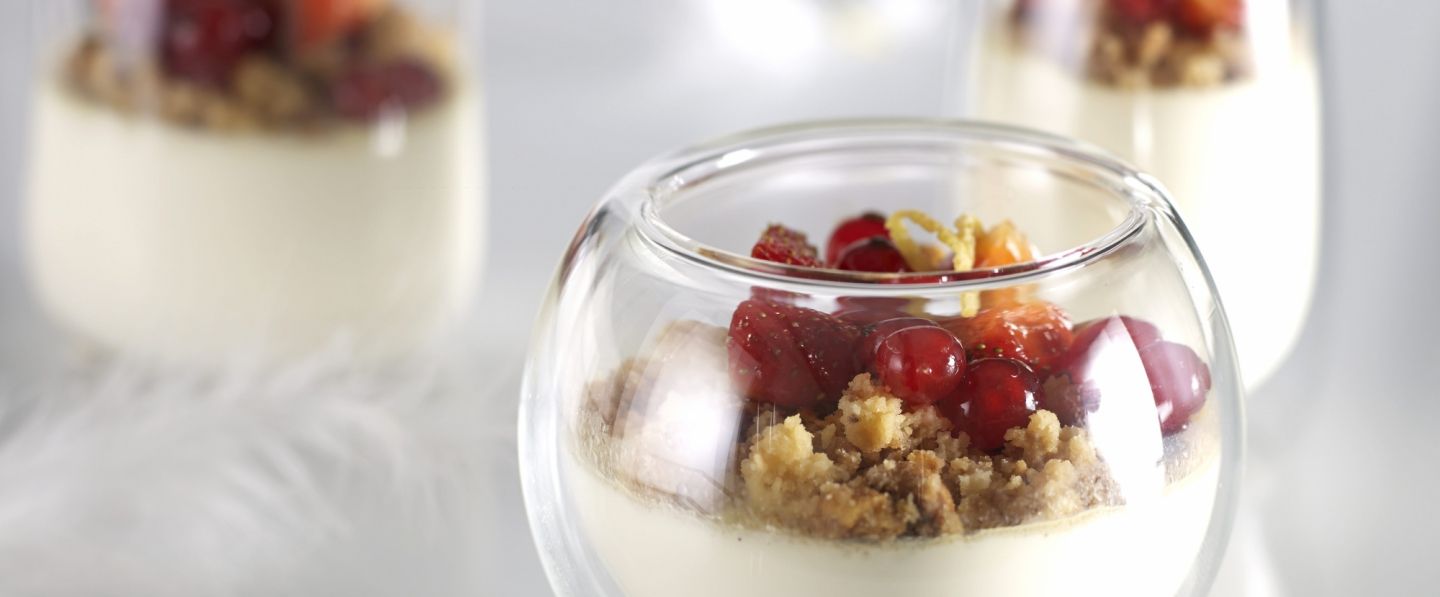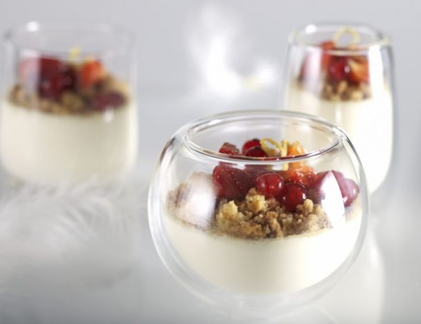 Sortir les verres de panna cotta du réfrigérateur, disposer les cerises caramélisées et le crumble. Savourer.