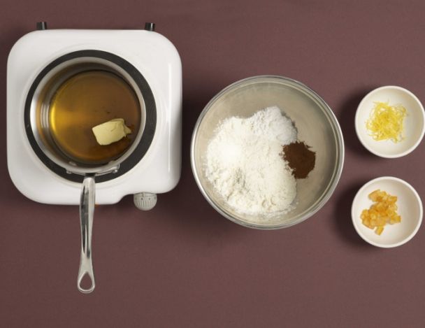 Dans la cuve du batteur, mélanger la farine, une cuillère à soupe d'épices « à pain d'épices », la levure chimique, le zeste d'un citron non traité râpé et les écorces d'orange. Mouiller avec le mélange beurre-miel et pétrir pendant 16 minutes.