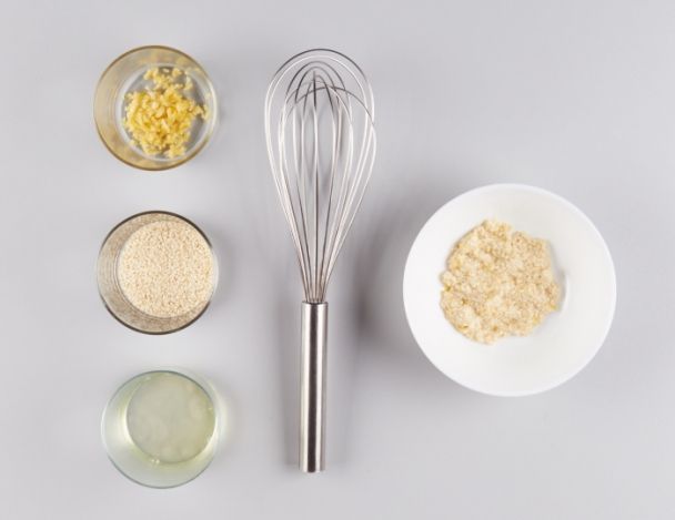 Prélever et hacher les zestes des citrons confits au sel. Mélanger les graines de sésame, le blanc d'œuf et les zestes des citrons confits, de manière à obtenir un mélange compact.