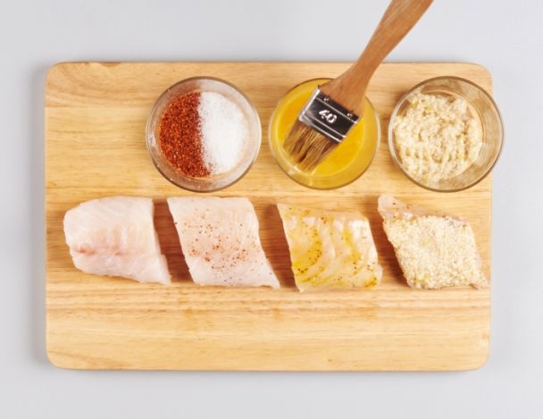 Couper le filet de cabillaud en 4 pavés, garder les parures pour la brandade. Assaisoner les pavés de cabillaud, de sel et de piment d'Espelette. Recouvrir les pavés de jaune d'œuf puis de la préparation à base de sésame.