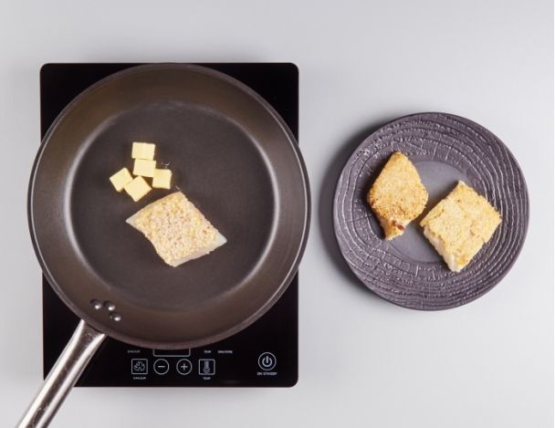 Cuire les pavés dans une poêle antiadhésive, 2 minutes du côté peau, afin que les graines de sésame croûtent immédiatement. Retourner ensuite les pavés de cabillaud, et laisser cuire 4 à 5 minutes en arrosant régulièrement.