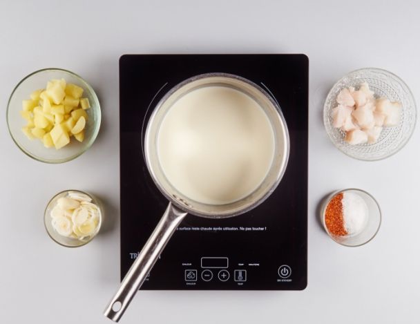 Pour la brandade, faire frémir la crème liquide assaisonnée de sel et de piment d'Espelette. Verser les pommes de terre taillées en morceaux grossiers, les parures de cabillaud, la gousse d'ail et la partie blanche du poireau taillée en rouelles.