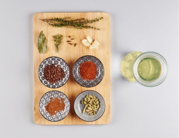 Déposer les épices dans un récipient. Ajouter les gousses d'ail pelées et éclatées, la branche de thym, la branche de romarin et les feuilles de laurier. Verser ensuite l'huile de tournesol. Fermer la bouteille, laisser l'huile infusée pendant 2 semaines.