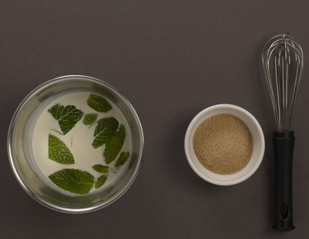 Retirer les feuilles de menthe. Ajouter le sucre et fouetter énergiquement jusqu'à ce que la crème épaississe.