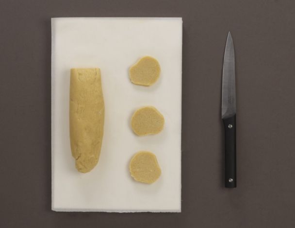 Former des rouleaux de 10 cm de diamètre et laisser durcir au frais pendant 2 heures. Couper des disques de 0,5 cm d'épaisseur, les poser sur une plaque et enfourner à 180°C (th,6) pendant 12 minutes. Disposer sur une grille.