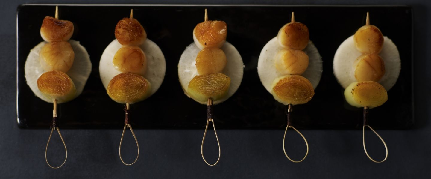 Préparer douze petites brochettes en alternant poireaux et pétoncles. Quand le caramel de soja est épais, mettre les brochettes dans la poêle et enrober en les retournant. Faire cuire 3 min.