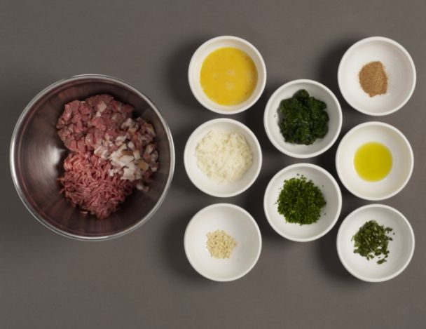 MoyenDans un saladier réunir le bœuf le veau et la poitrine fumé hachés. Rajouter le vert d’épinard concassé, le parmesan râpé, l’ail haché et les œufs battus en omelette. Terminer avec le persil et le basilic hachés, verser l’huile d’olive et la muscade.