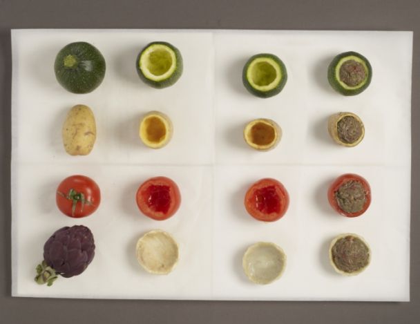 Tourner les artichauts violets en pointe. Retirer le foin des artichauts à l’aide d’une cuillère à pomme Parisienne. Cuire les artichauts à l’eau citronnée avec la farine, le thym et les gousses d’ail écrasées.