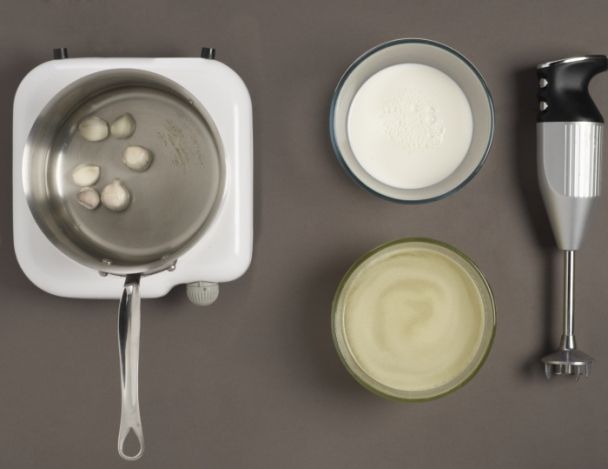 puis mixer avec les gousses d’ail. Assaisonner. Réserver.