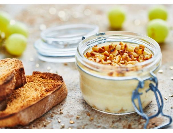 Préchauffer le four à 150°C (th.5). Battre les œufs entiers et ajouter-les à la crème. Répartir les raisins blonds dans des petits pots individuels. Ajouter la crème de foie gras jusqu'à 0,5 cm du bord des pots. Placer les pots dans un plat à bords hauts, et ajouter de l'eau jusqu'à la mi-hauteur du plat. Enfourner 45 minutes.