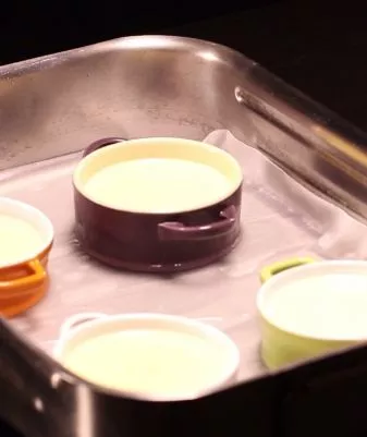 En fin de cuisson, vérifier que les crèmes sont prises puis les sortir du four. Réserver au frais quelques heures.
