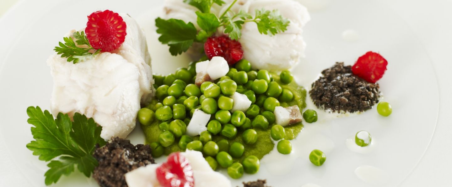 Dresser la lotte, la purée de ptits pois, les olives et les pois. Décorer les assiettes avec les framboises.