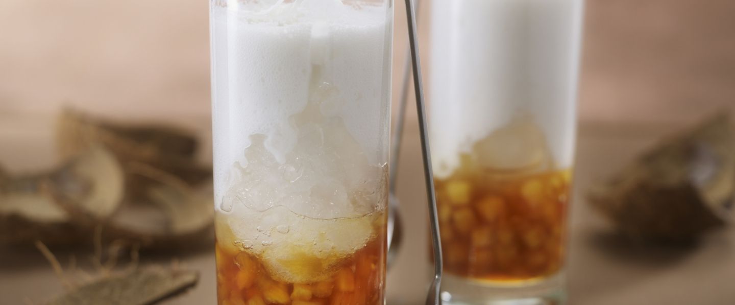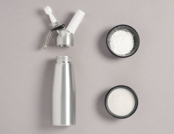Mélanger le lait de coco avec le sucre glace et mettre dans un siphon. Réserver au frigo.