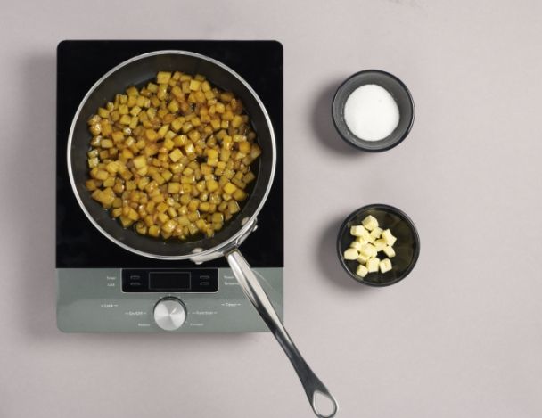 Carameliser les dés d'ananas dans une poêle anti-adhésive avec le beurre et 20g de sucre. Laisser refroidir.