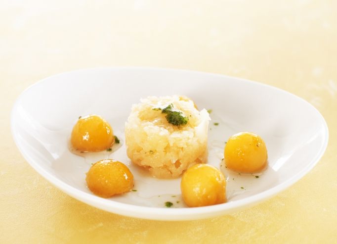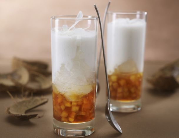 Dans un verre, mettre l'ananas caramélisés, au dessus la mousse de lait de coco puis le granité au rhum. Parsemer avec les copeaux de Noix de coco.