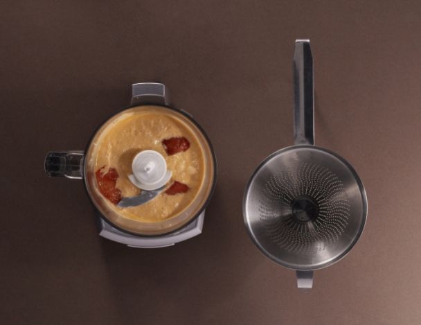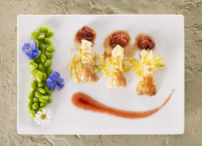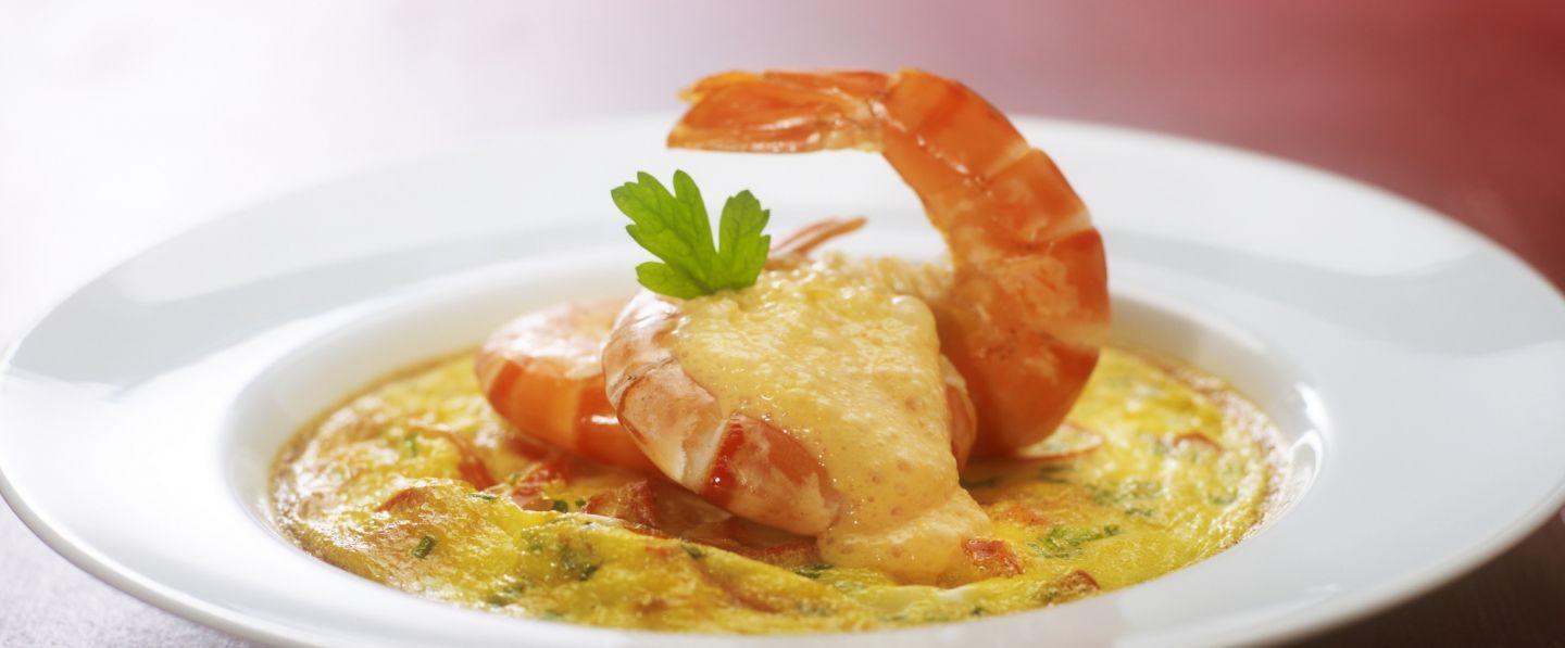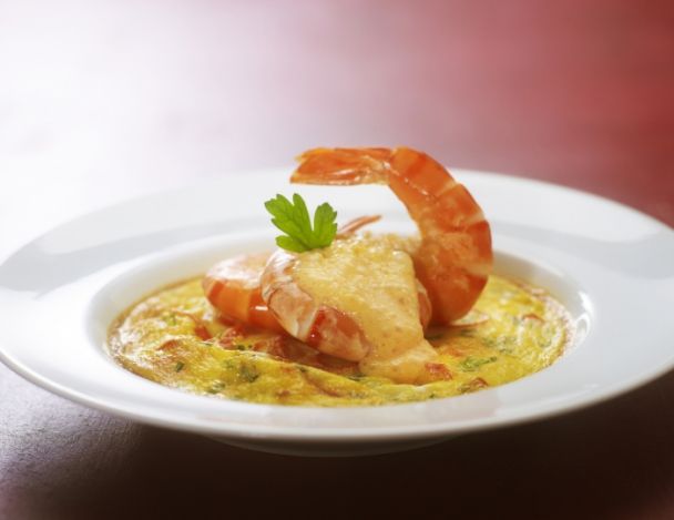 Cuire les gambas à la plancha et les déposer sur la pipérade, ajouter l’émulsion de poivrons.