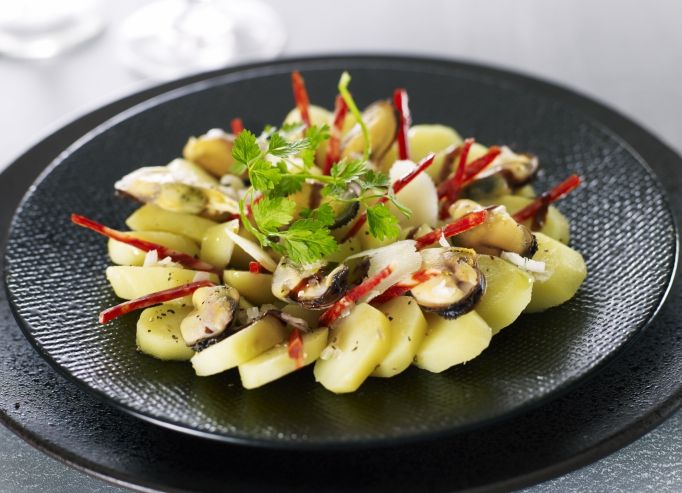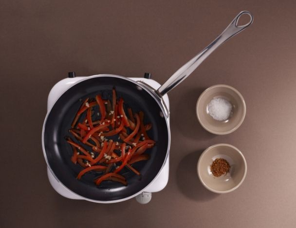 Eplucher et épépiner les poivrons puis les émincer finement en julienne. Hacher 1 gousse d’ail et colorer dans de l’huile d’olive puis ajouter la julienne de poivrons. Sel et piment. Retirer du feu et laisser infuser.
