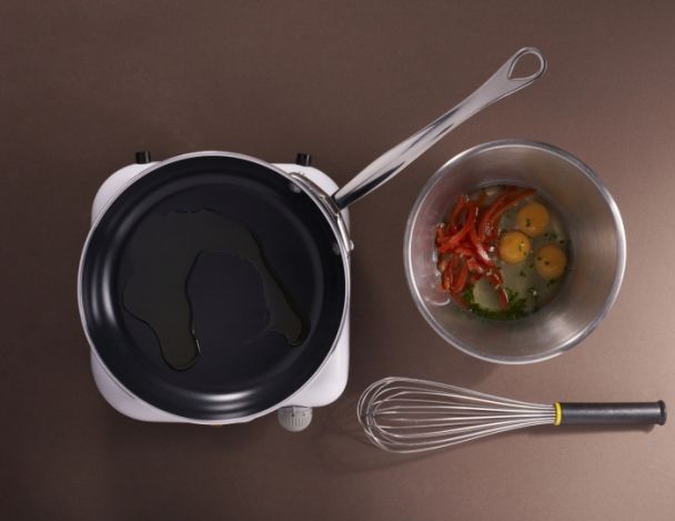 Casser les œufs, ajouter les poivrons infusés, la ciboulette ciselée et assaisonner. Fouetter l’appareil et faire cuire dans une poêle chaude avec un trait d’huile d’olive. Remuer avec une fourchette. Il faut que le mélange soit baveux. Laisser refroidir.