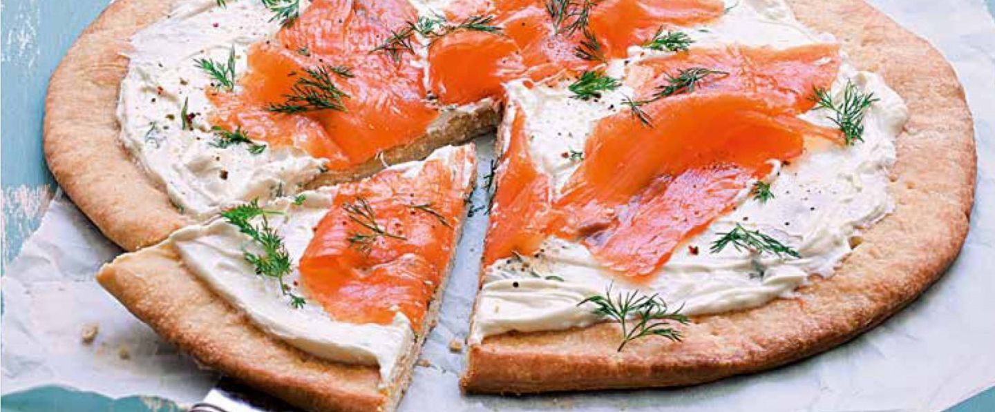 Mélangez le fromage frais avec l’aneth et du poivre. Étalez cette préparation sur la pâte jusqu’à un centimètre du bord, recouvrez de saumon fumé et servez immédiatement.
