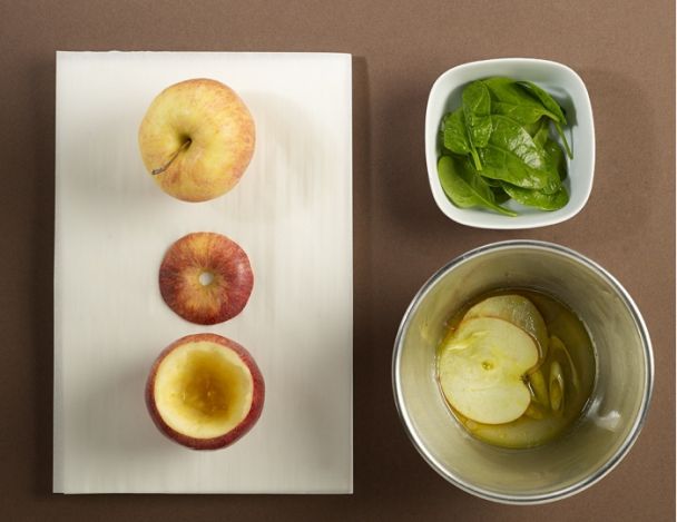 Pendant ce temps, couper le chapeau des 6 pommes puis les vider sans les percer ni les abîmer. Frotter les pommes au citron pour qu’elles ne noircissent pas. Placer au congélateur.