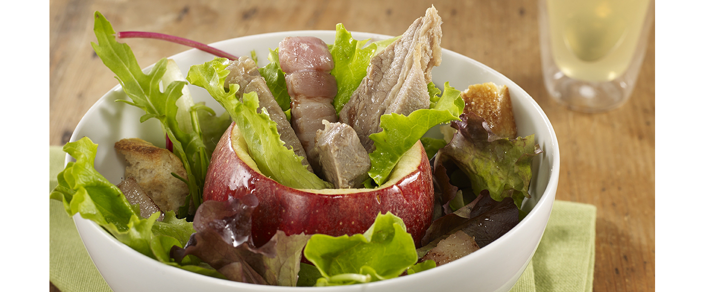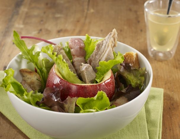 Pour le dressage, prendre de grands bols à petit déjeuner mais vraiment de très grands bols. Ajouter la salade, placer les pommes au centre et rles remplir des tranche de viandes préalablement taillées. Faire déborder celles-ci, ajouter les lardons et deux ou trois croûtons. Servir accompagné des verres de gelée, si vous ne pouvez pas tout mettre dans les pommes, dresser le reste en plat. Surtout toujours très bien assaisonner.