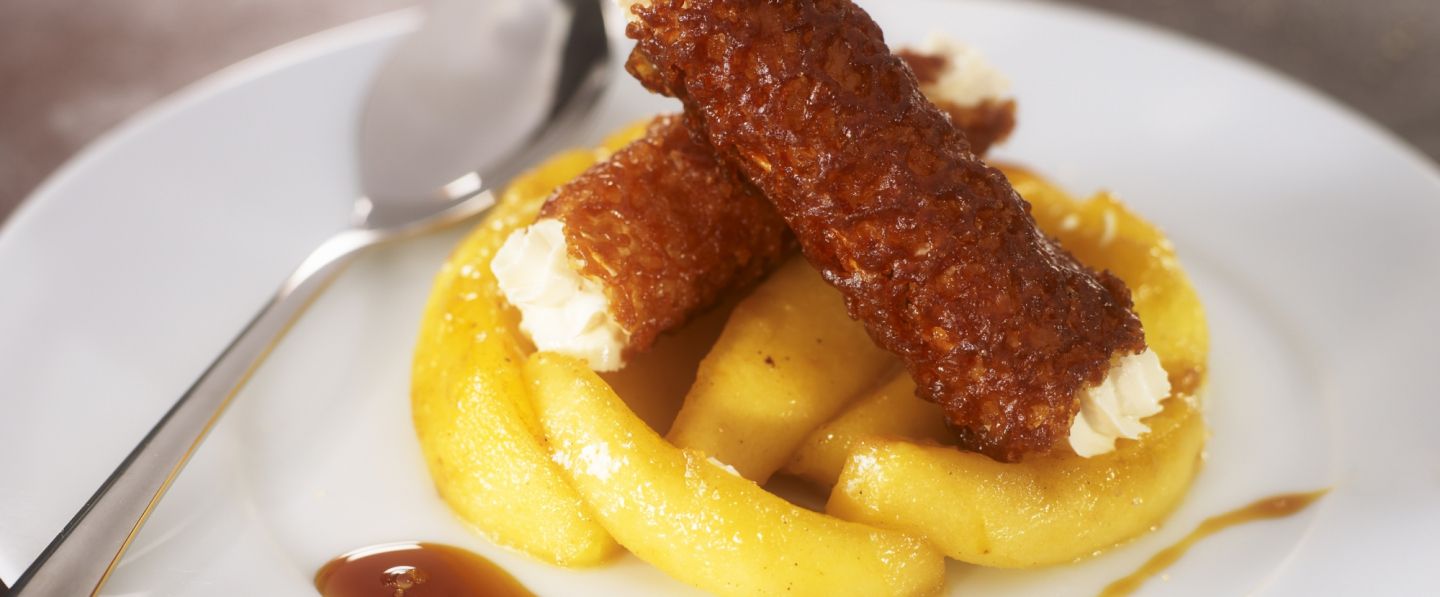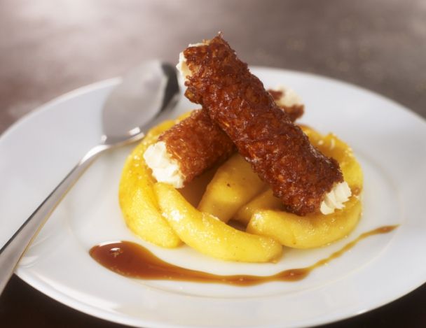 Pour un dessert aux fruits cuits, optez pour les pommes poêlées du chef Marc Faivre, et leurs cannelloni à la mousse de bière brune