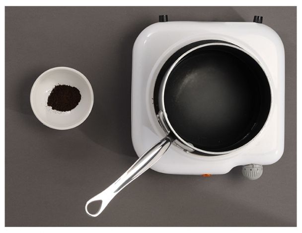 A ébullition, jeter le café, remuer et le laisser presque déborder 2 fois de suite. Retirer