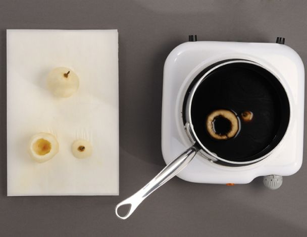 Plonger les poires et leur chapeau dans le café. Couvrir la casserole d’un linge humide et faire pocher à feu doux durant 8 minutes puis retirer et laisser refroidir dans la casserole.