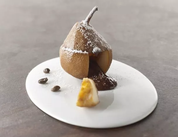 Le chef Alexanian vous propose une recette de poire cuite au café et son coulant au chocolat. Ce mariage subtil de la poire, du café et du chocolat vous séduira à coup sûr lorsque viendra la fin du repas.