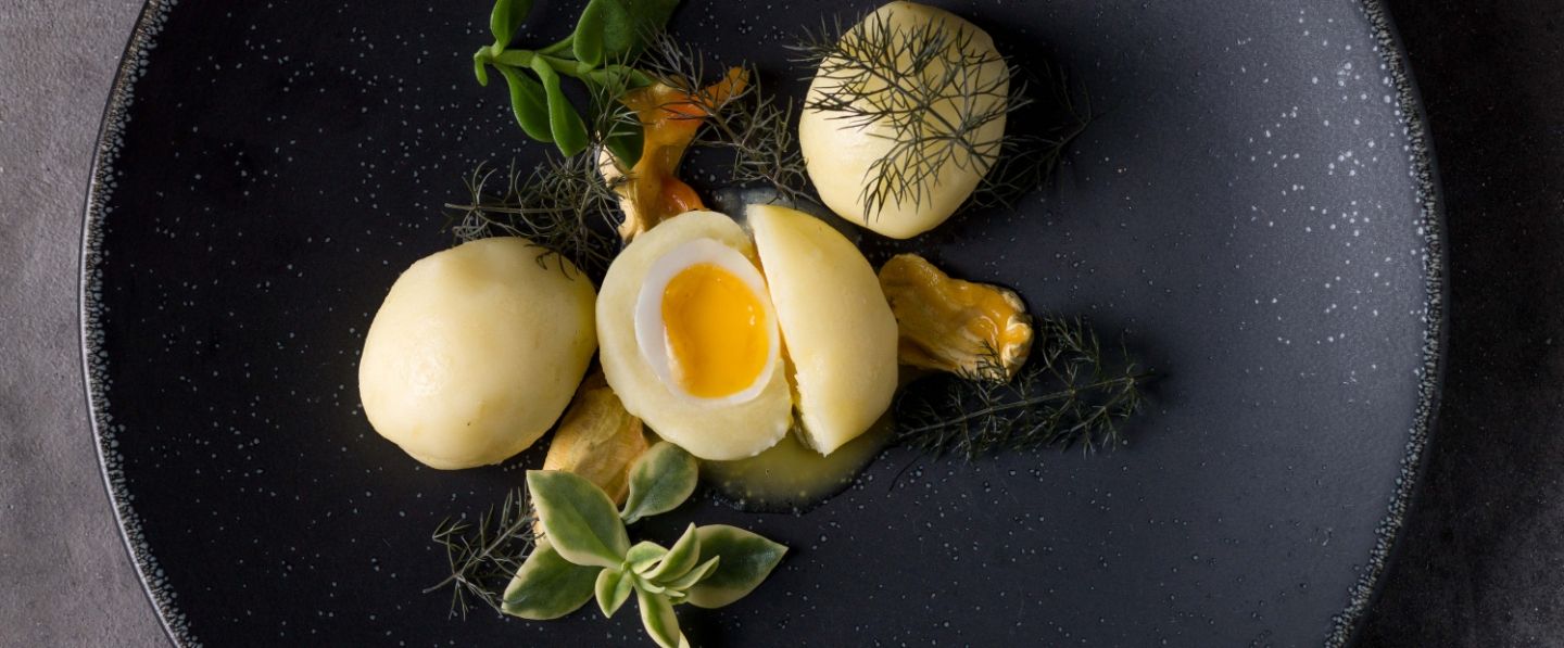 Cette subtile recette de Pierre Augé assemble des pommes de terre, en leur centre des oeufs de caille, et en accompagnement : des violets, ces coquillages surnommés figues de mer...