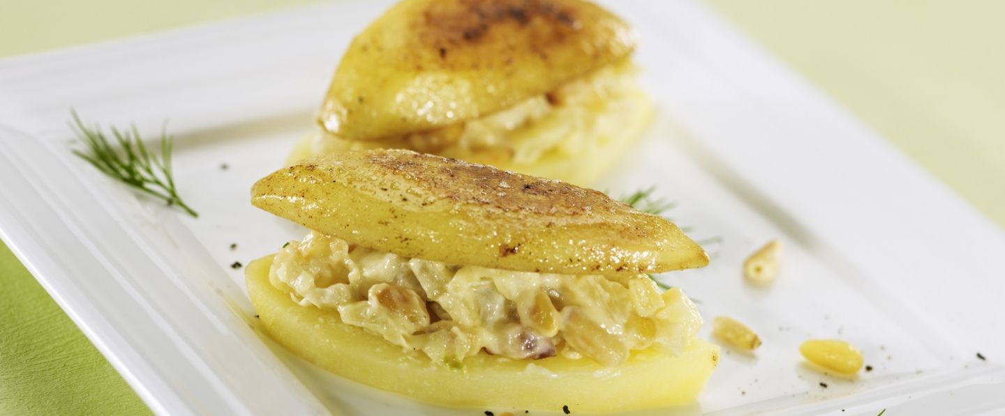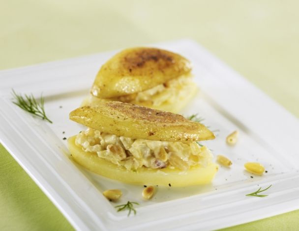 Découper un chapeau aux pommes de terrre, déposer une quenelle de farce, puis replacer les chapeaux.