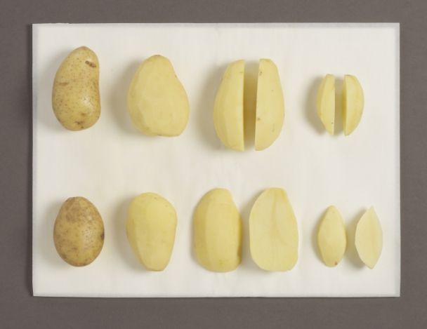 Eplucher et découper les pommes de terre afin qu'elles soient toutes de la meme taille et en forme de calisson bombés ou de barques retournées. Les couper dans le sens de l'épaisseur pour avoir un fond bien plat.