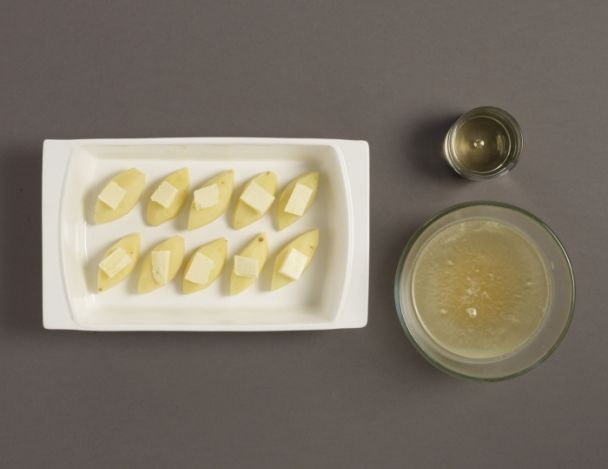 Déposer les pommes de terre dans un plat. Assaisonner d'une pincée de sel et de sucre et répartir dessus 50 g de beurre détaillé en morceaux. Mouiller avec le vin blanc et un peu de bouillon de volaille: le liquide doit arriver à mi-hauteur des pommes de terre. Faire cuire au four pendant 30min.