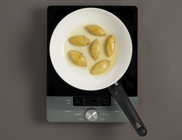 Lorsque les pommes de terre sont fondantes, glacer les dans une poêle anti-adhésive afin de les caraméliser dans leur jus de cuisson. Réserver.