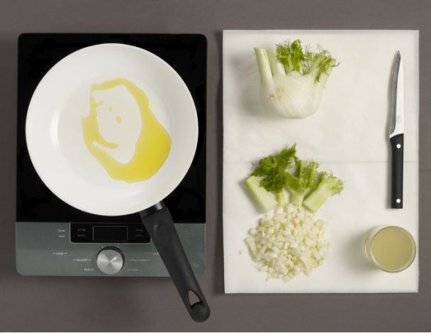 Faire chauffer un peu d'huile dans un poêle. Couper en dés les fenouils et les faire sauter avec une pincée de sel et de sucre.
