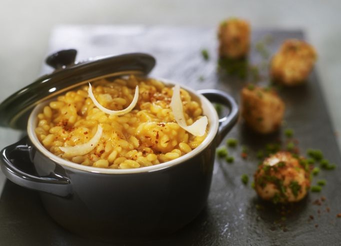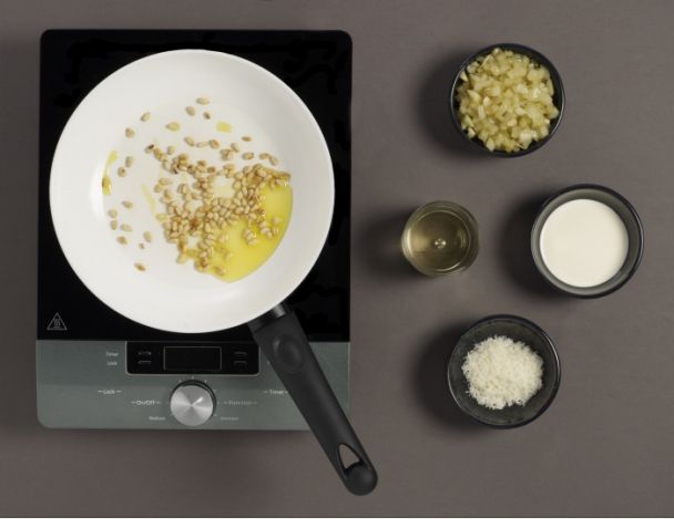 Dans une petite pôele séparée, faire dorer les pignons de pin dans le restant de beurre, puis ajouter les fenouils fondants, ainsi que la crème, le Martini, et le parmesan. Laisser réduire un peu et réserver.
