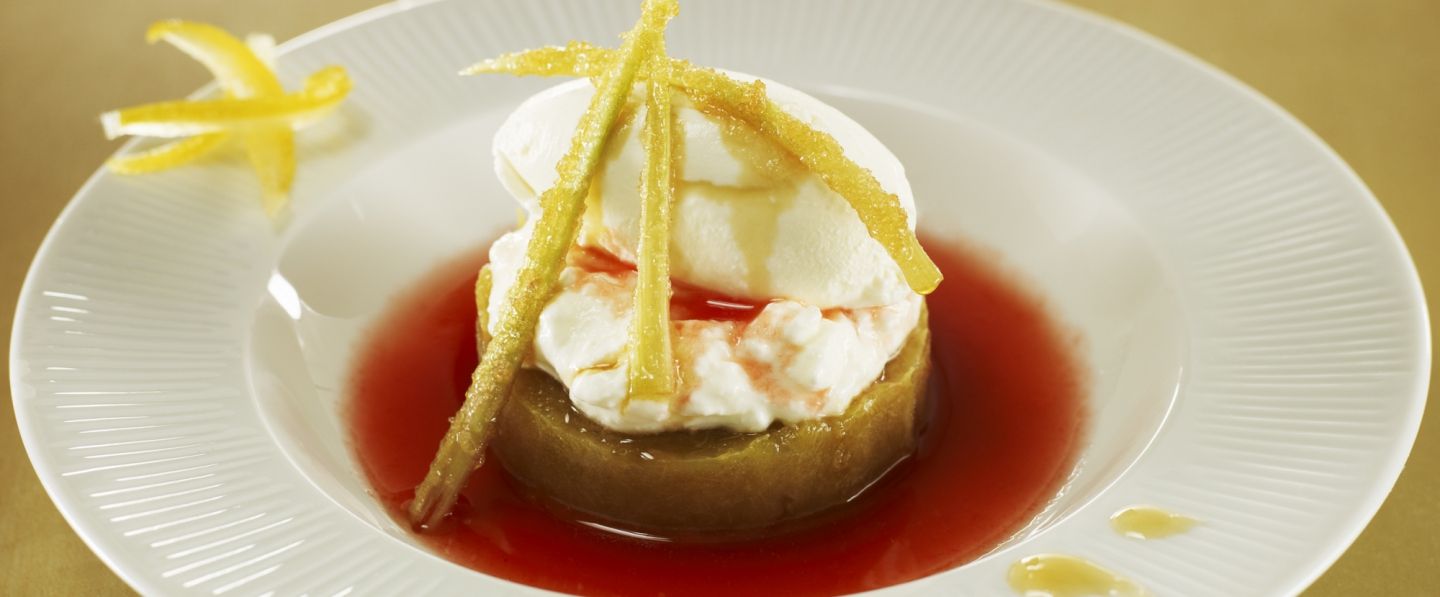 Éplucher et émincer les tiges de rhubarbes. Mettre à cuire les rhubarbes dans une casserole avec sucre roux, miel et un peu d’eau pendant environ 2 heures à feu doux. Une fois cuit, mettre à égoutter. Garder le jus de cuisson pour le dressage.
