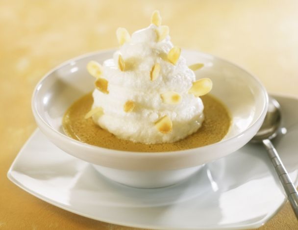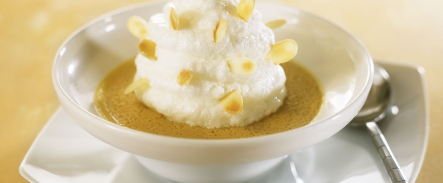 Cette île flottante est dressée sous forme de pyramide piquée aux amandes. Dégustez cette préparation légère, à la crème anglaise caramel, pour conclure un repas très gourmand !
