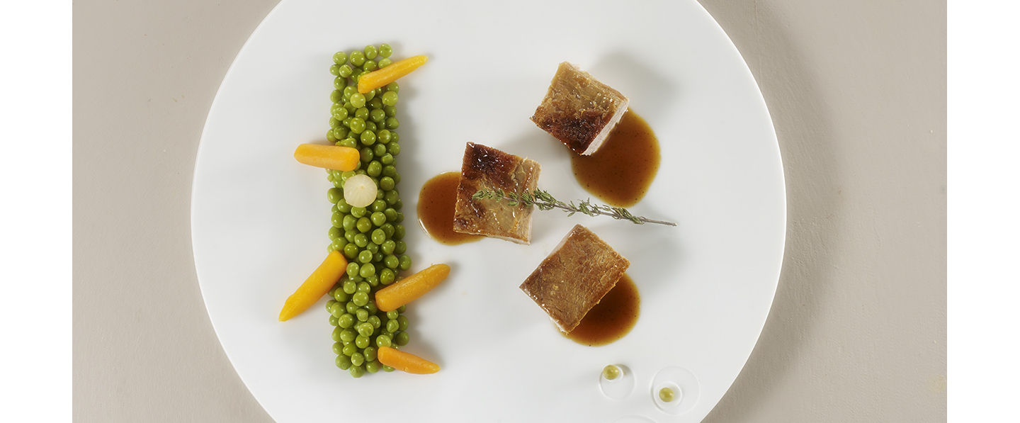 Dégraisser légèrement le jus de cuisson et faire réduire pendant 3-4 minutes. Ajouter les petits pois carottes et faire mijoter pendant 5 minutes.