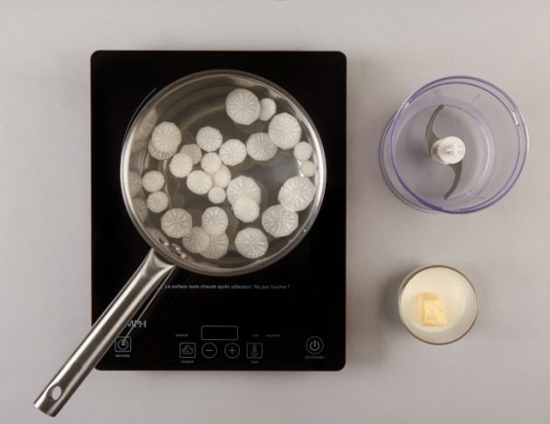 DifficileDans une grande casserole d’eau, cuire le raifort tranché très finement. Une fois cuit, mixer en détendant avec du lait et monter au beurre.