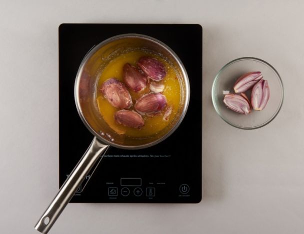 Couper les échalotes avec la peau. Dans une sauteuse faire fondre le beurre, ajouter un zeste d’orange, un morceau de piment et une gousse d’ail écrasée. Poser les échalotes dans la sauteuse côté chair. Laisser confire doucement sur le coin de la plaque.