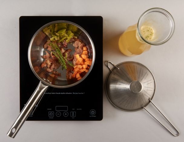Puis mouiller avec 2 litres de bouillon et laisser réduire. Passer au chinois et terminer le jus en réduisant jusqu'à obtention de jus corsé.
