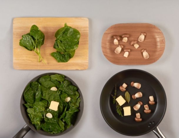 Equeuter les épinards. Dans un sautoir, préparer un beurre noisette avec une gousse d’ail écrasée, y tomber les épinards rapidement, et assaisonner de sel et noix de muscade râpée.
