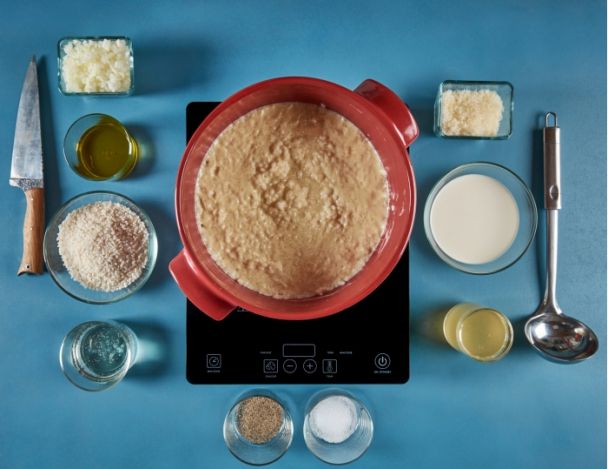 Ciseler l'oignon finement puis le faire suer dans une cocotte. Ajouter le riz et le nacrer (le faire devenir translucide). Déglacer avec le vin blanc et réduire complètement la préparation. Mouiller avec 2 louches de bouillon de volaille, remuer jusqu'à complète absorbtion. Renouveller l'opération jusqu'à cuisson complète du riz soit 18min. Enfin, ajouter le parmesan et la crème fraîche afin de lier le tout. Verser dans un plat à gratin sur 3cm de hauteur et laisser prendre au froid pendant 3h.