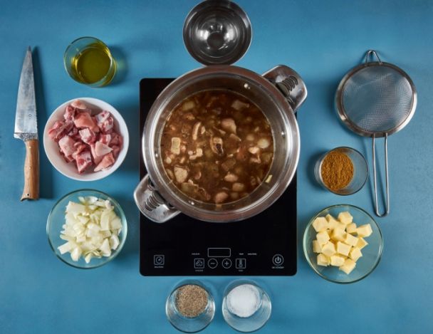 Tailler les parures de veau en petits dés. Les faire colorer à brun dans une cocotte dans un peu d’huile d’olive. Ajouter les oignons et faire suer. Mouiller avec de l’eau à hauteur et faire réduire. Passer au chinois étamine. Réserver. Dégraisser si nécessaire, puis faire réduire jusqu’à l’obtention d’une consistance nappante. Ajouter le garam massala et monter au beurre puis garder le jus au chaud.